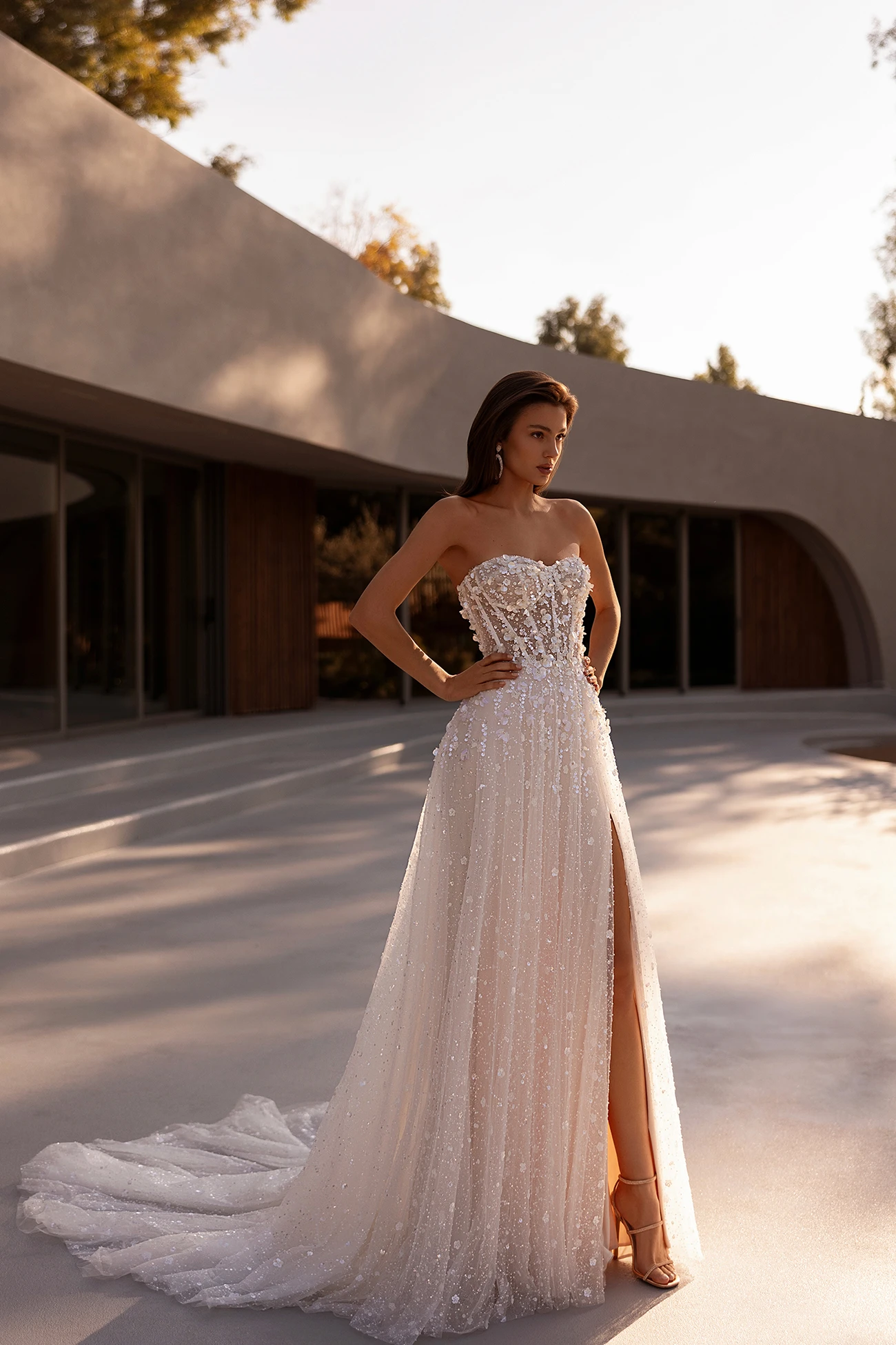 Εντυπωσιάστε με αυτό το λαμπερό στράπλες νυφικό φόρεμα με κέντημα από παγιέτες, όπου η λάμψη συναντά μια απαλή σιλουέτα. Το σέξι σκίσιμο προσθέτει μια παιχνιδιάρικη νότα στην απόλυτη γοητεία του.