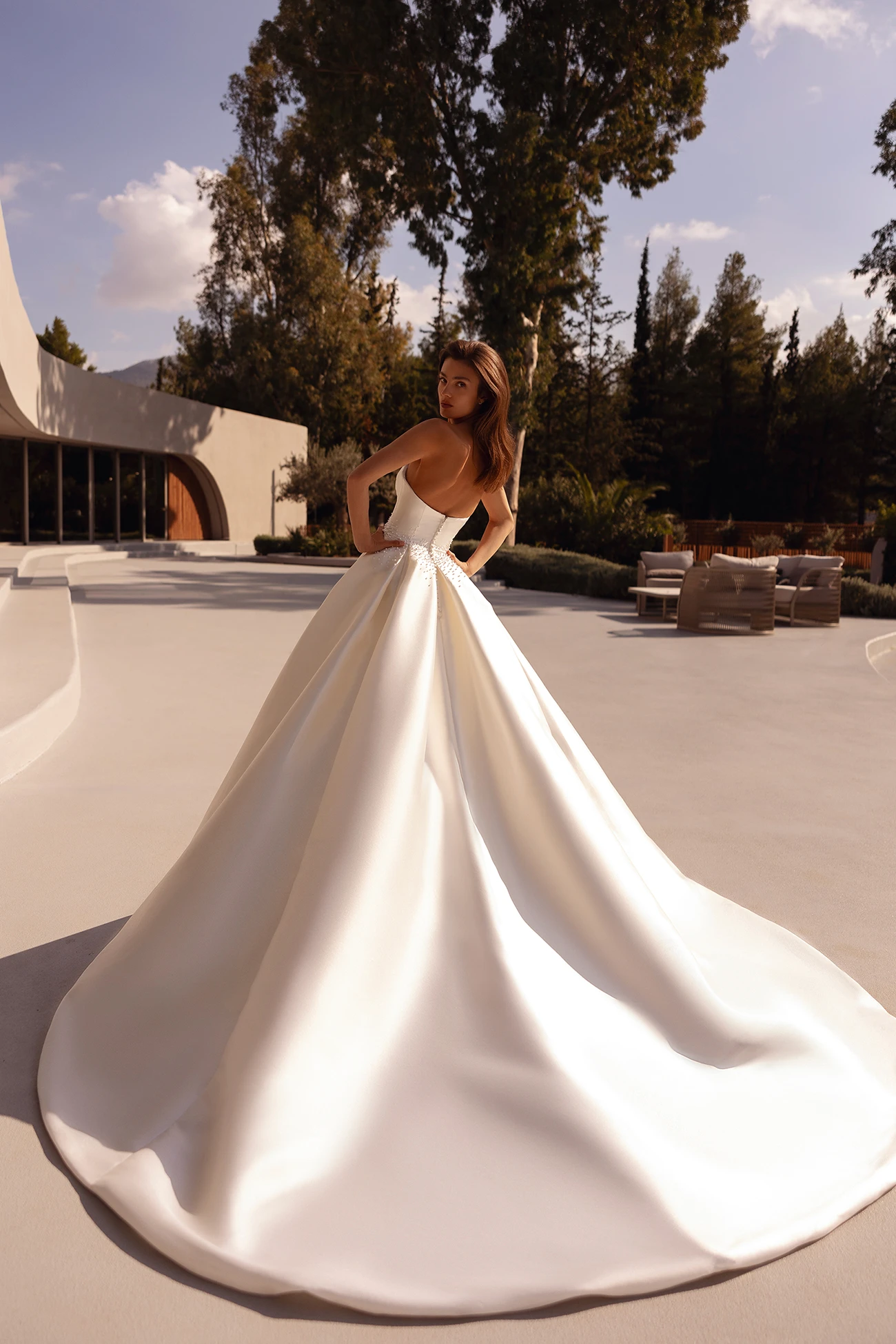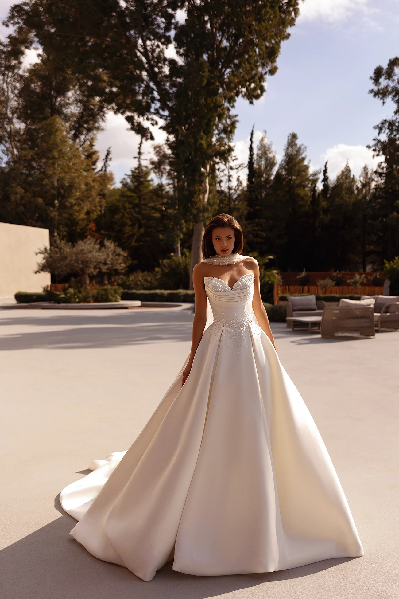 Ένα τολμηρό στράπλες νυφικό μπούστο σε σχήμα καρδιά, διακοσμημένο με πέρλες. Σε Mikado ή σατέν. Η φούστα σε γραμμή Α ολοκληρώνει το εντυπωσιακό σύνολο. Ιδανικό για μια αξέχαστη νυφική εμφάνιση.