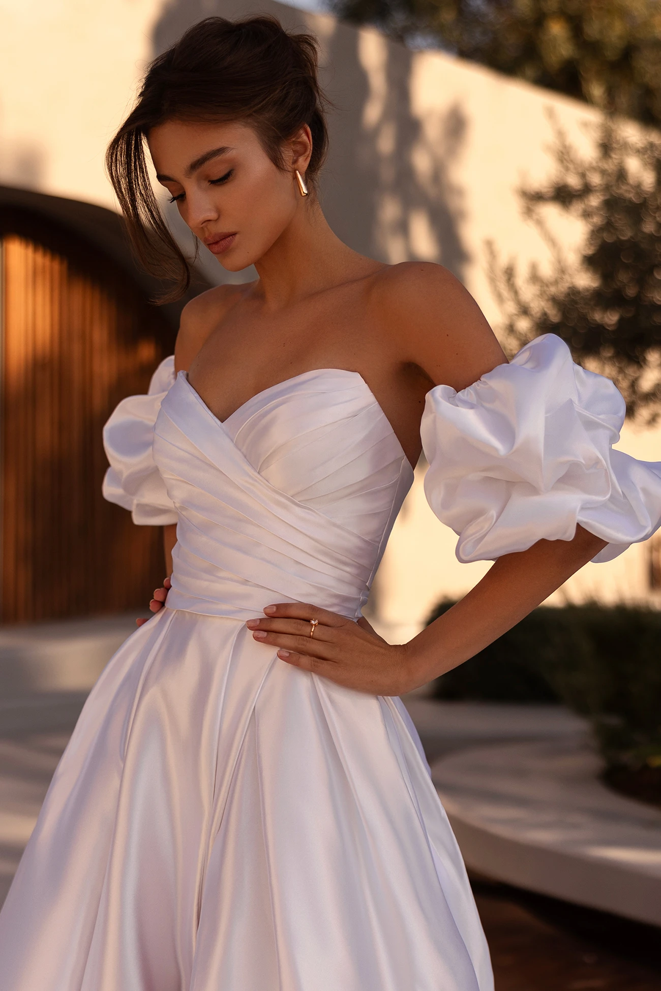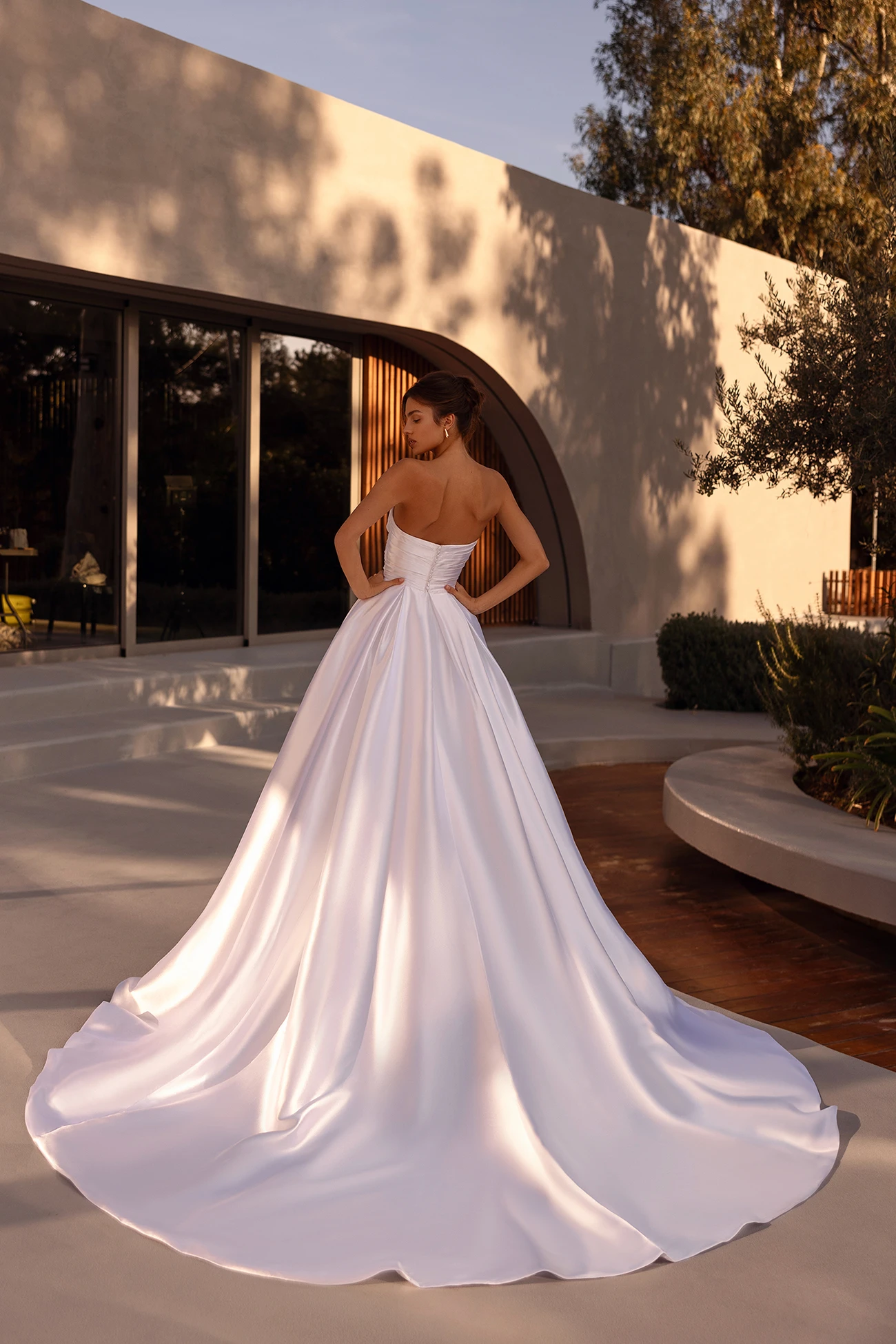 Το ντραπέ στράπλες μπούστο δένει αρμονικά με τη φουσκωτή φούστα και το εντυπωσιακό σκίσιμο μπροστά. Τα αέρινα, προαιρετικά μανίκια (SL105) προσθέτουν μια ρομαντική, ονειρική πινελιά. Διαθέσιμο σε Luxe Dupione και Silk Gazar.