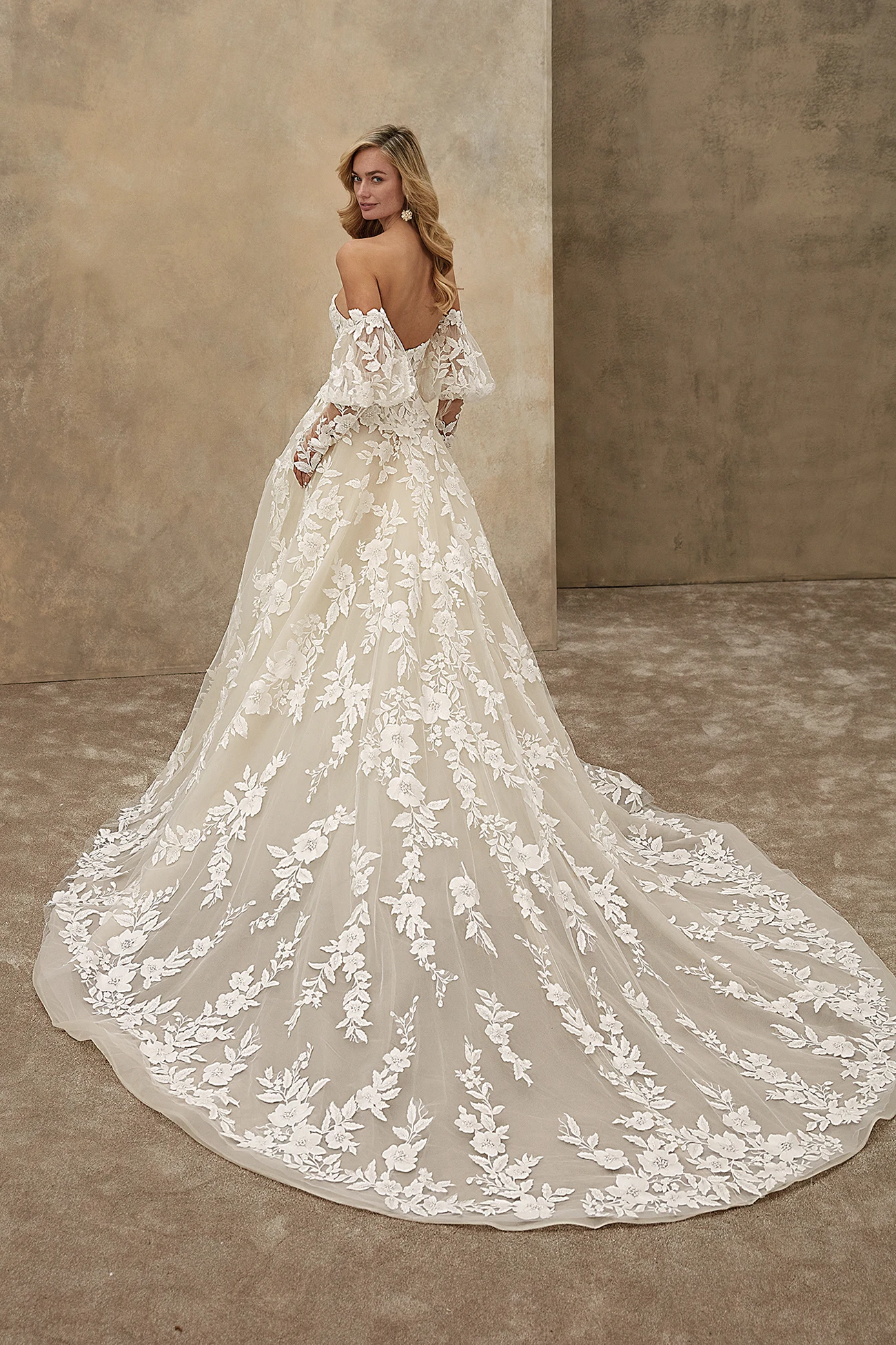 Ένα νυφικό εμπνευσμένο από την ομορφιά της φύσης, το Style 1538 αναδεικνύεται μέσα από πλούσια δαντέλα με κεντήματα, χαρίζοντας μια ρομαντική και φυσική αύρα σε κάθε του λεπτομέρεια. Διαθέτει ρομαντικό ντεκολτέ σε σχήμα καρδιάς και σμιλεμένη γραμμή με διαφάνεια που αγκαλιάζει όμορφα τις καμπύλες. Η απαλή, φαρδιά φούστα με ουρά ολοκληρώνει την κομψή σιλουέτα. Για μια πινελιά μαγείας, προσθέστε την αέρινη αποσπώμενη overskirt και τα ονειρικά φουσκωτά δαντελένια μανίκια SL113 — ένα ζευγάρι φτιαγμένο για να μαγέψει.