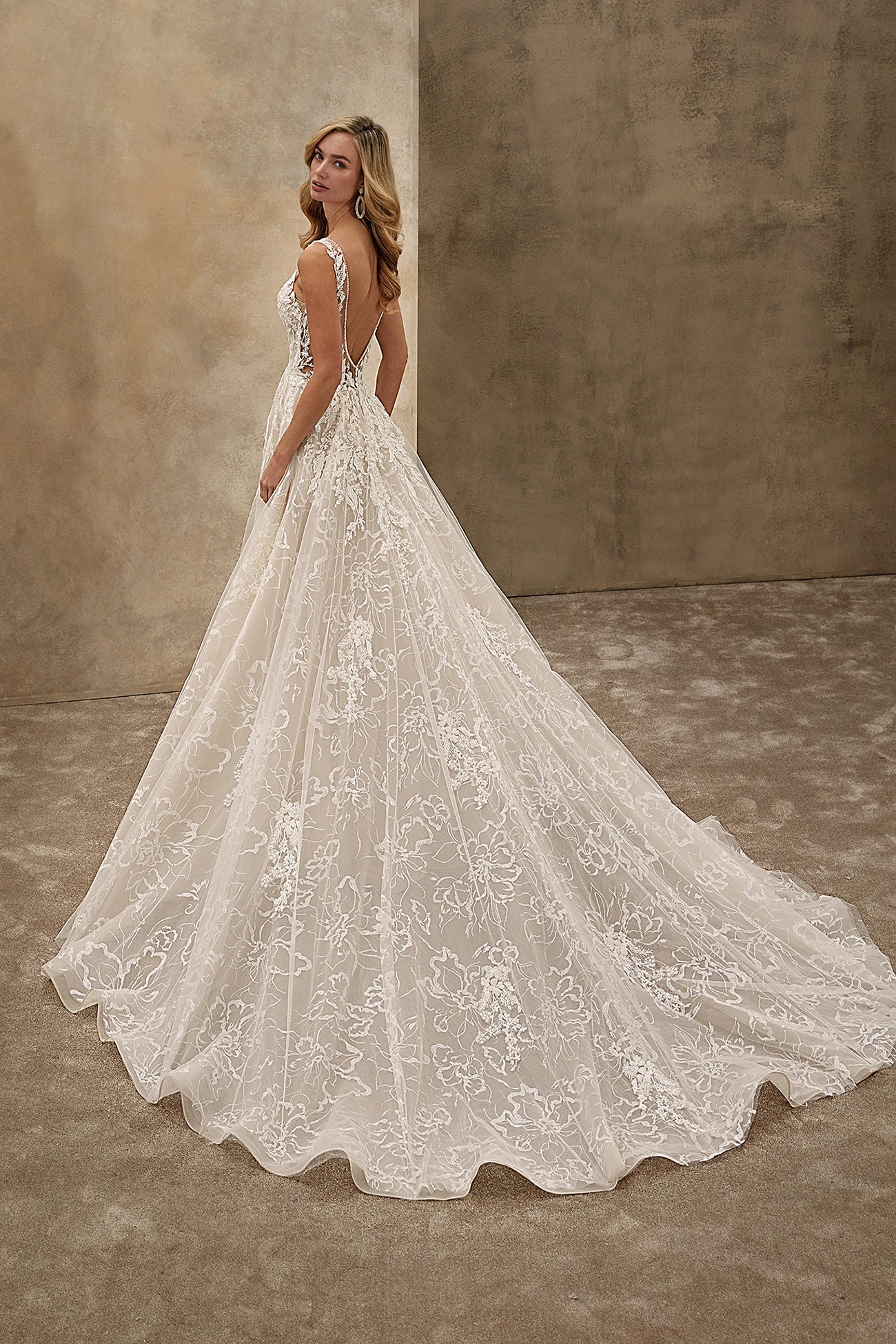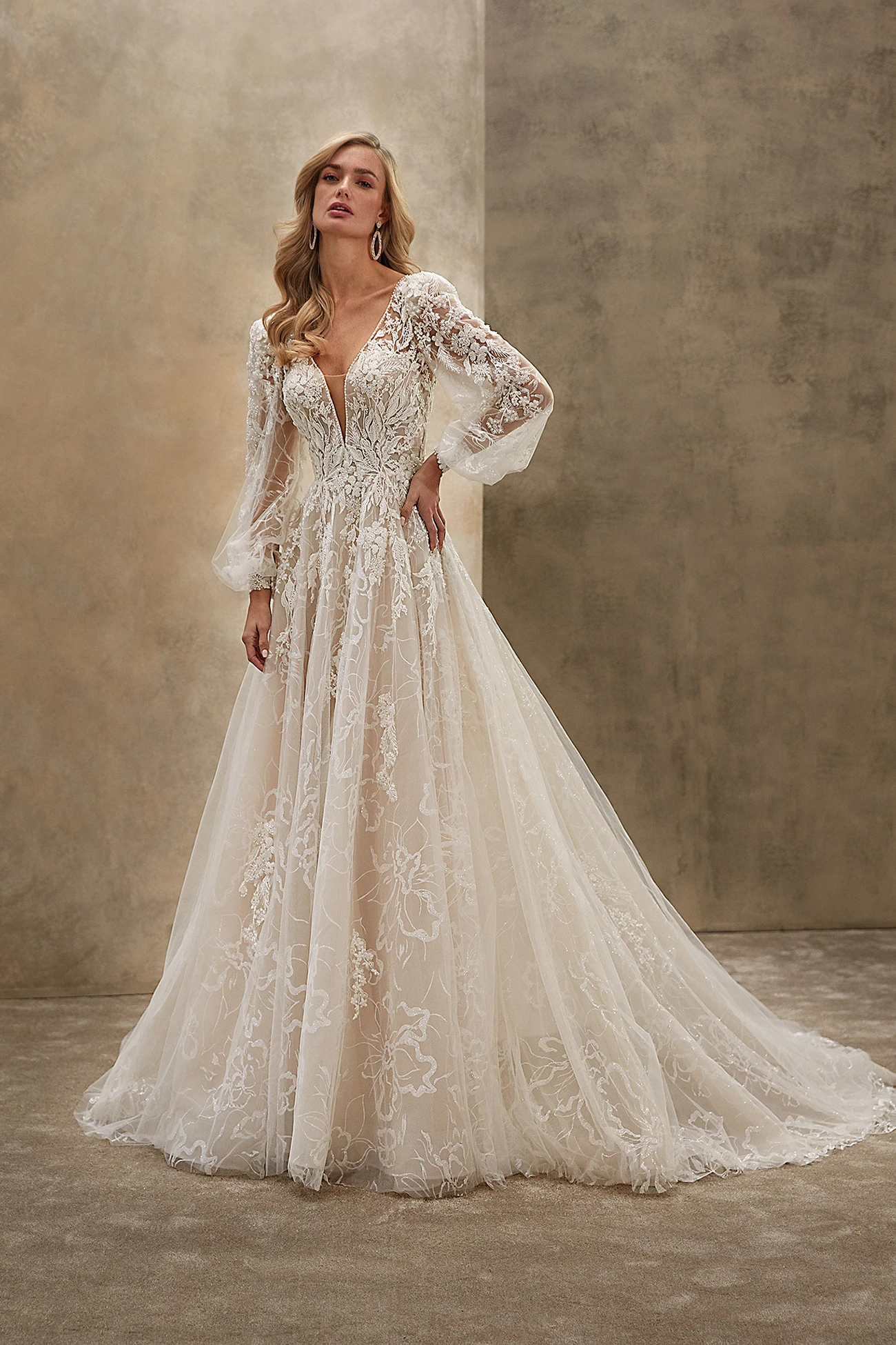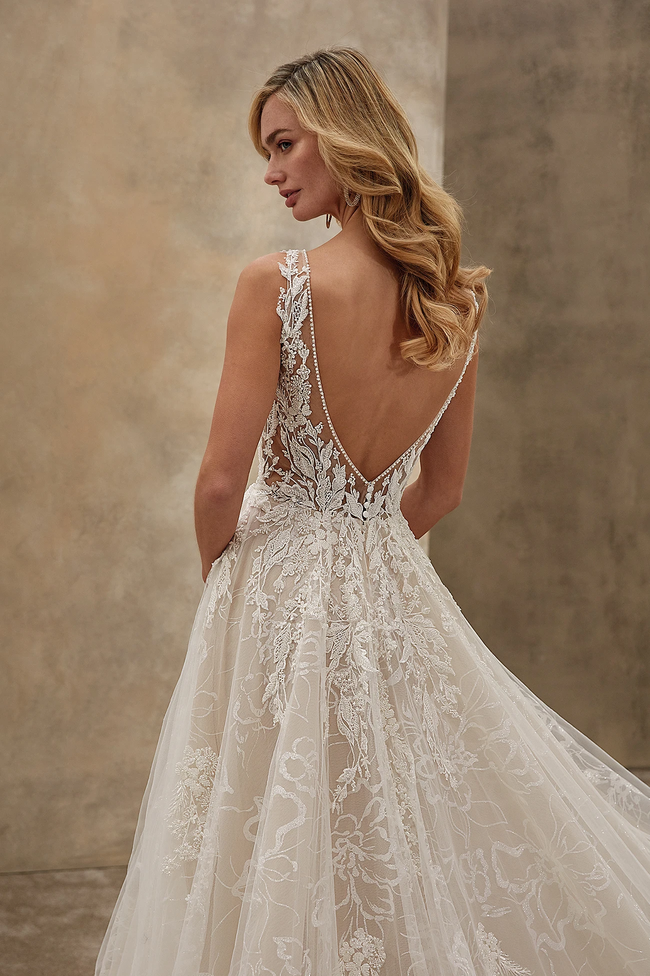 Ο ρομαντισμός συναντά την ευελιξία σε αυτό το ονειρικό νυφικό σε γραμμή Α, φτιαγμένο από δαντέλα με χάντρες και λαμπερό τούλι. Λεπτά φλοράλ απλικέ απλώνονται σε όλη το νυφικό, ενώ η βαθιά λαιμόκοψη προσθέτει μια διακριτική νότα γοητείας. Διατίθεται αμάνικο και συνοδεύεται από αποσπώμενα μακριά μανίκια προσφέροντας είτε έξτρα ένταση είτε μια πιο μοντέρνα, θεατρική αισθητική. Η εντυπωσιακή ουρά ολοκληρώνει την εμφάνιση.