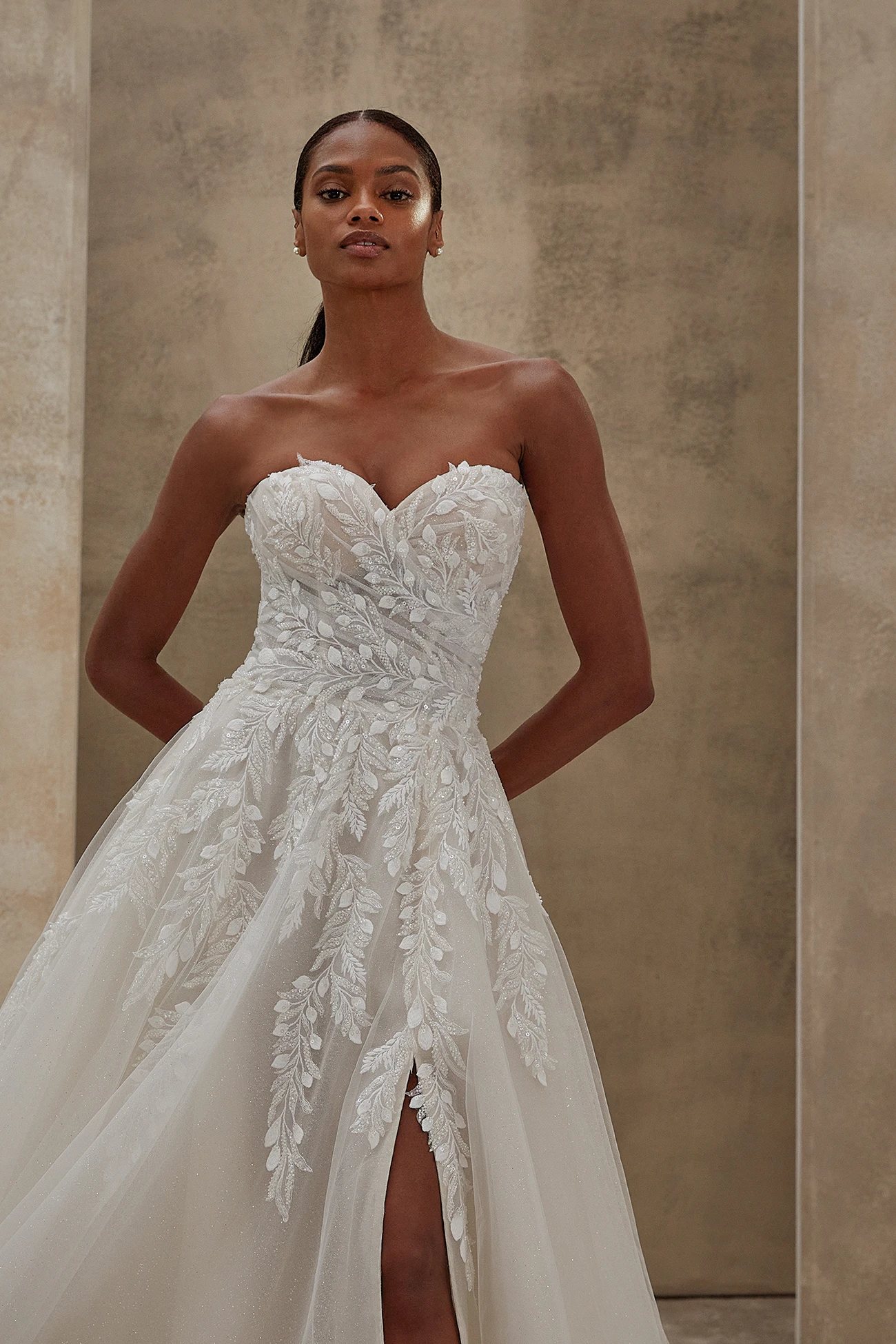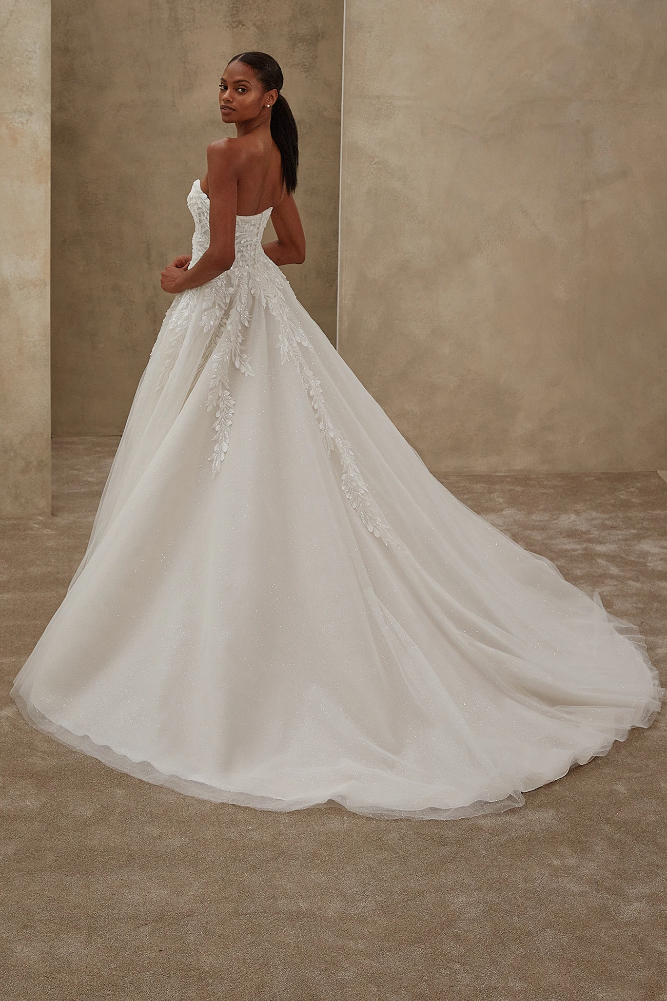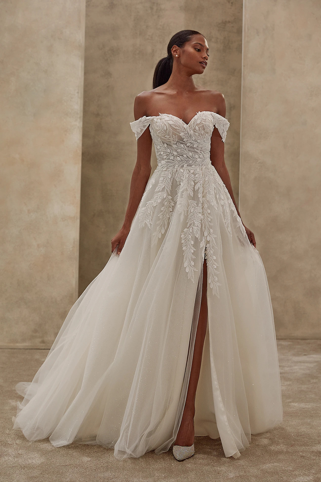 Μια μοντέρνα, παραμυθένια εμφάνιση με σαγηνευτική αύρα, το Style 1541 ξεχωρίζει με το εφαρμοστό μπούστο με ανοιχτούς ώμους, διακοσμημένο με δαντέλα και χάντρες. Η ονειρική φούστα από λαμπερό τούλι πέφτει σε απαλά layers και ανοίγει σε ένα τολμηρό μπροστινό σκίσιμο, προσφέροντας κίνηση και χάρη. Ιδανική επιλογή για τη νύφη που θέλει να συνδυάσει τον ρομαντισμό με μια σύγχρονη, εντυπωσιακή πινελιά.