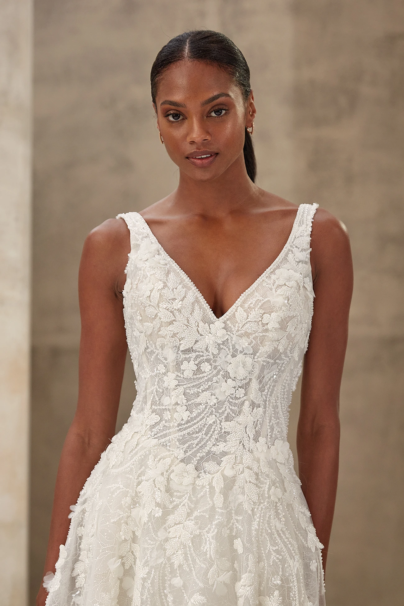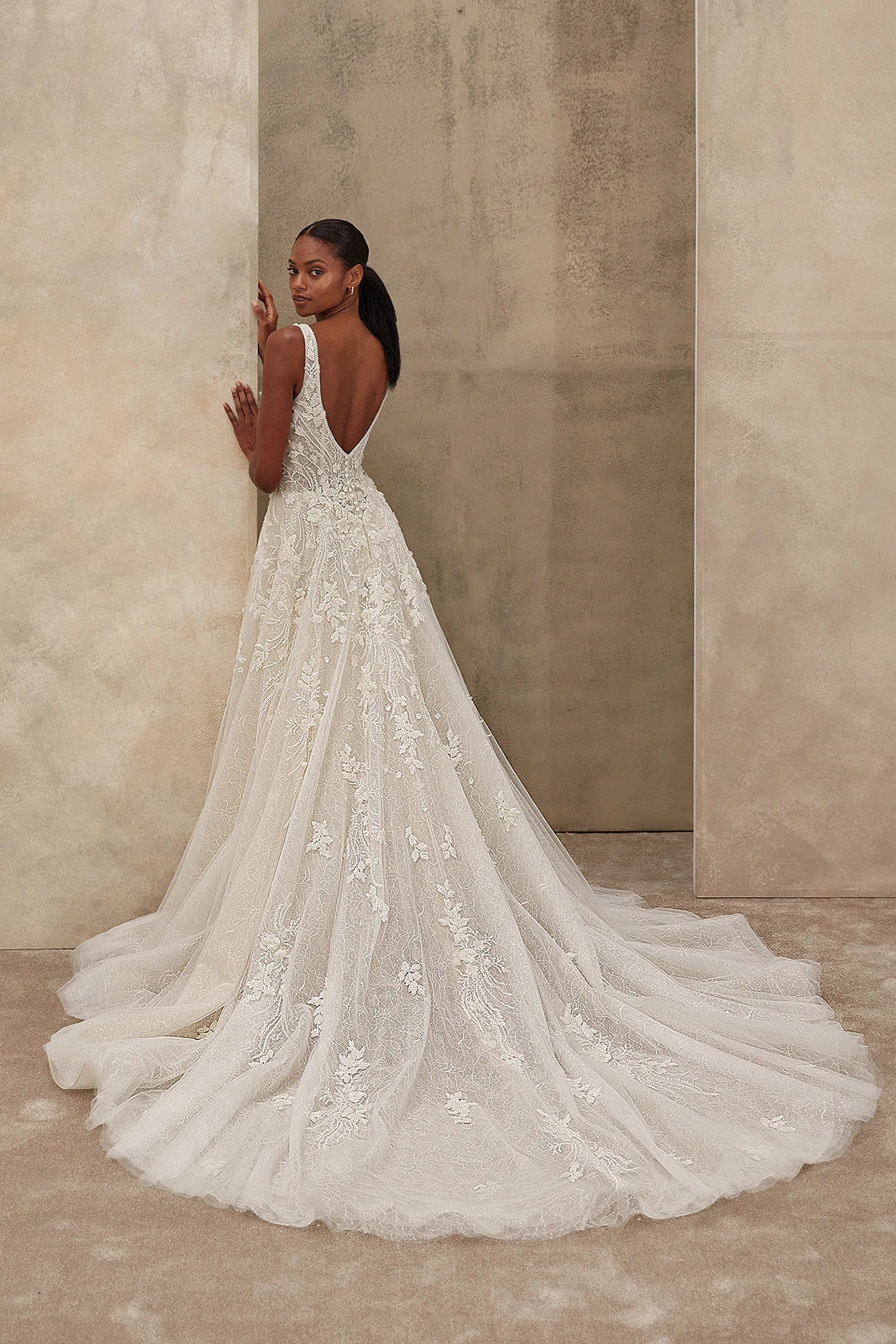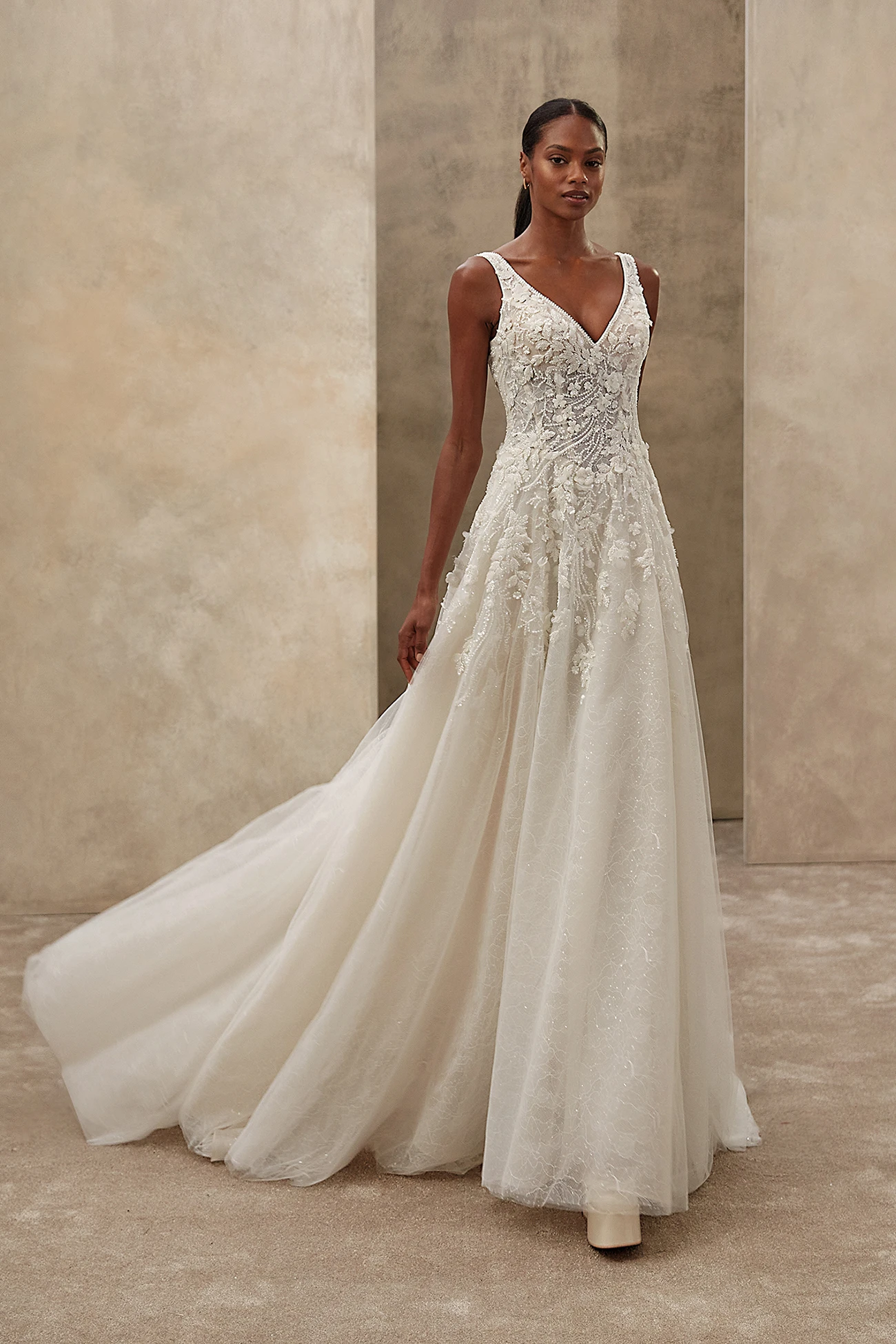 Ένα ονειρικό φόρεμα που συνδυάζει κομψότητα και κίνηση. Διαθέτει λαιμόκοψη σε σχήμα V και περίτεχνο μπούστο που αγκαλιάζει απαλά τη σιλουέτα, ενώ η απαλή, φαρδιά φούστα σε γραμμή Α ρέει με χάρη. Η δαντέλα με χάντρες, το λαμπερό τούλι και η δαντελένια επένδυση δημιουργούν μια λαμπερή, αιθέρια όψη από κάθε γωνία. Η βαθιά, καμπυλωτή πλάτη προσθέτει μια γοητευτική πινελιά σε αυτή τη ρομαντική δημιουργία.