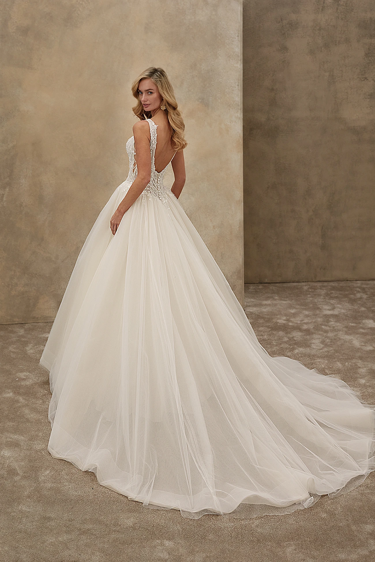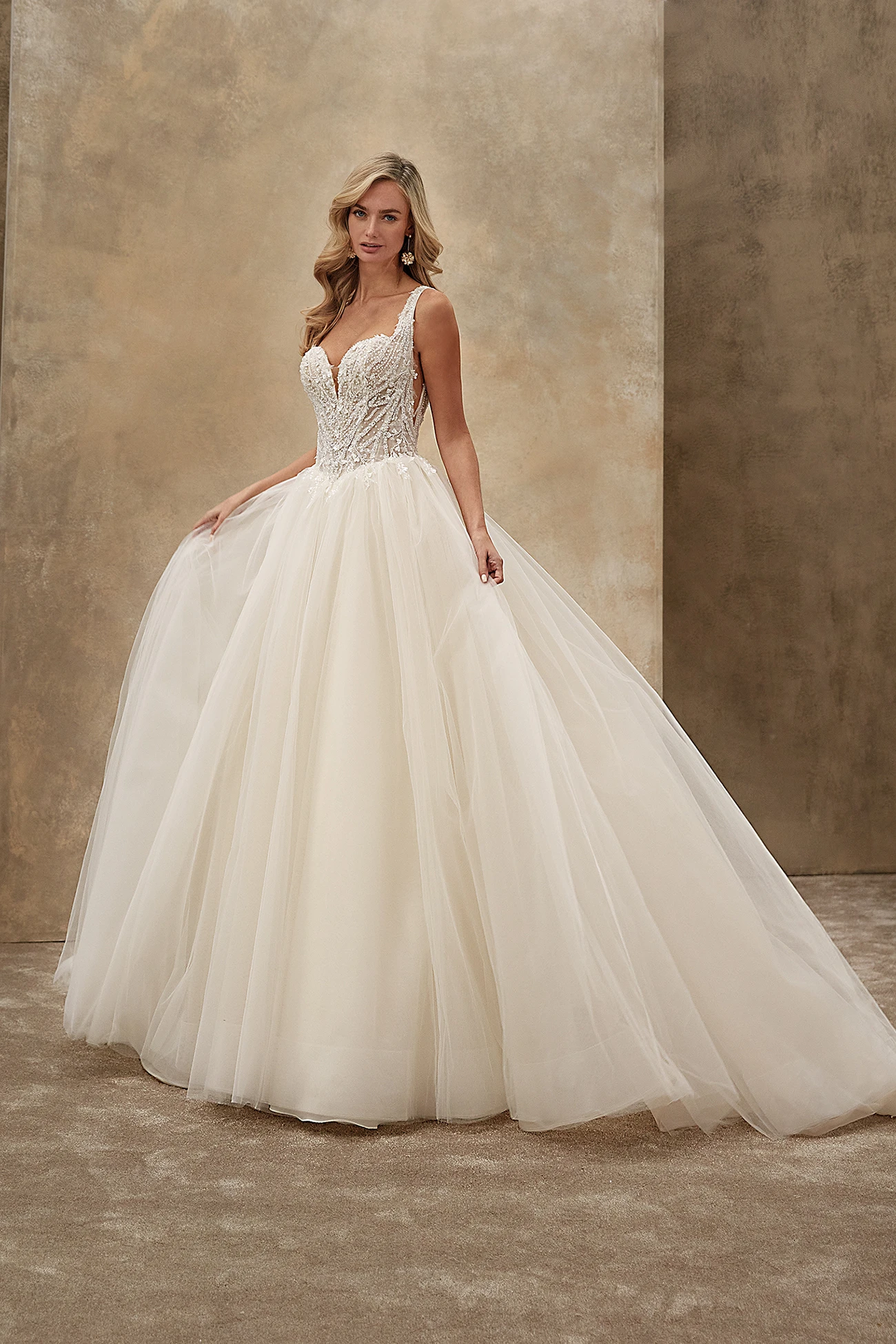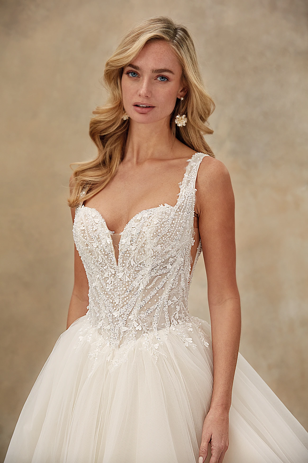 Ένα ονειρικό νυφικό με εντυπωσιακό κεντημένο μπούστο και λεπτές τιράντες, που συνδυάζεται αρμονικά με μια ανάλαφρη, φουσκωτή φούστα από τούλι, για μια παραμυθένια και ρομαντική εμφάνιση.