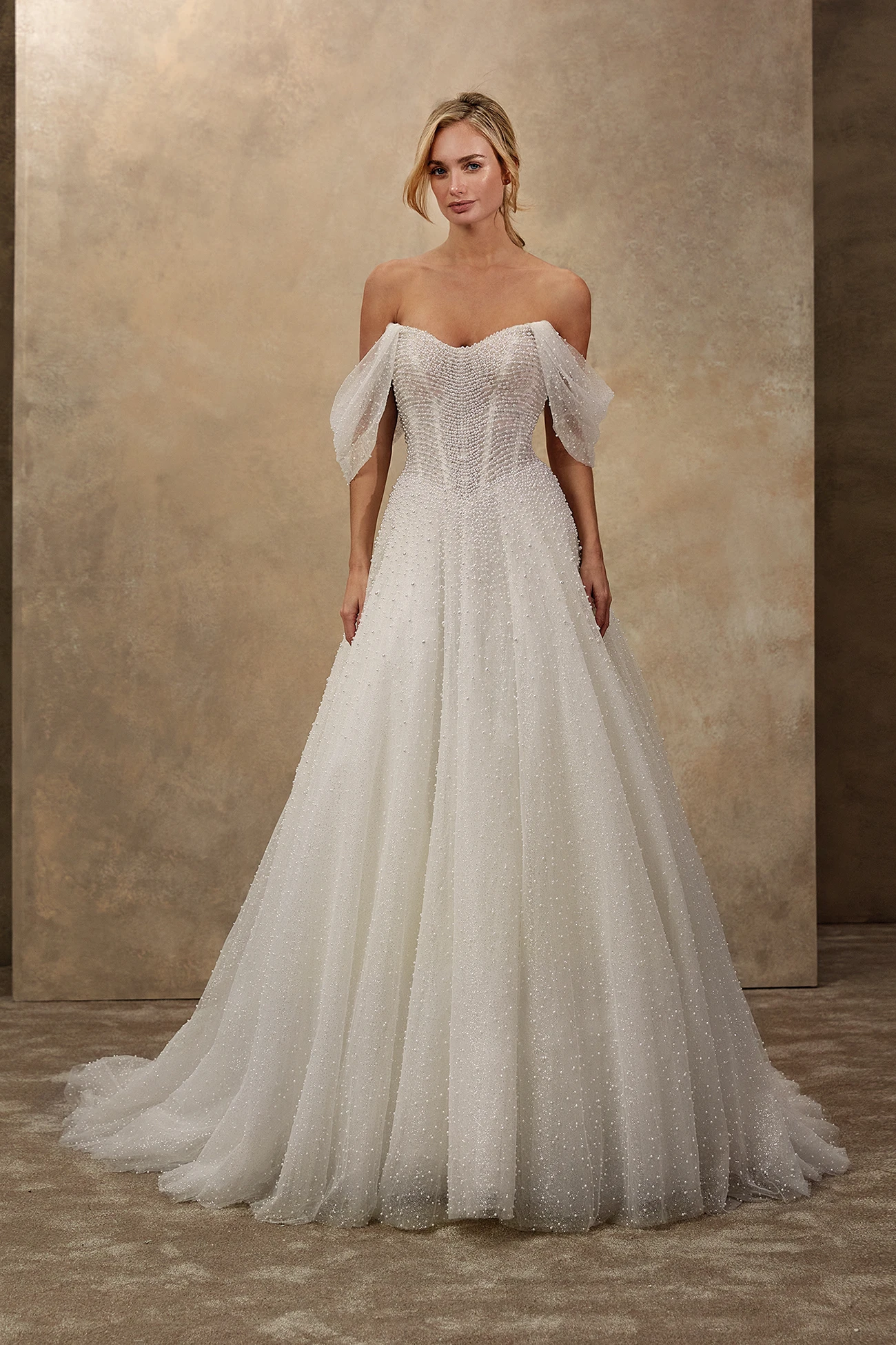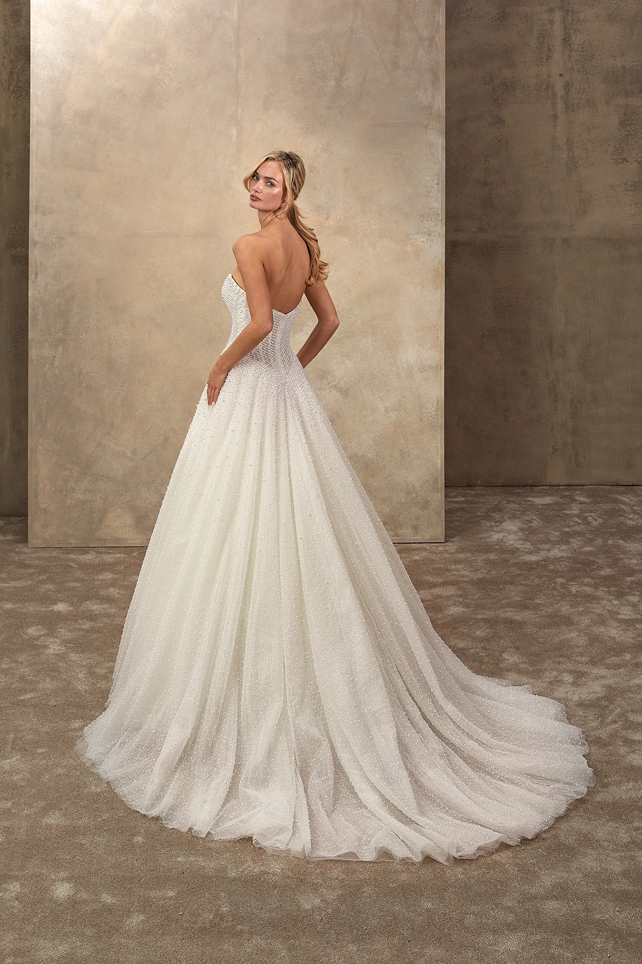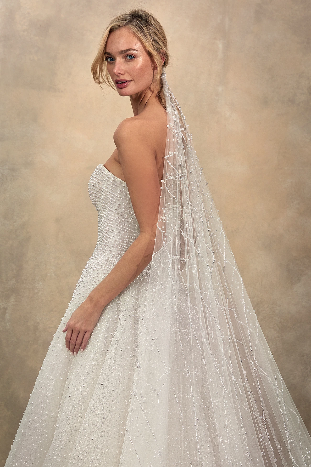 Μια ονειρική ισορροπία απαλότητας και λάμψης. Αυτό το νυφικό χωρίς τιράντες, διακοσμημένο με πέρλες και χάντρες πάνω σε λαμπερό τούλι, συνδυάζεται αρμονικά με αφαιρούμενα μανίκια ανοιχτού ώμου που χαρίζουν ρομαντική κίνηση. Ολοκληρώστε την εμφάνιση με το ασορτί κορμάκι με ψηλό ντεκολτέ από πέρλες T259 και το αιθέριο πέπλο V339.